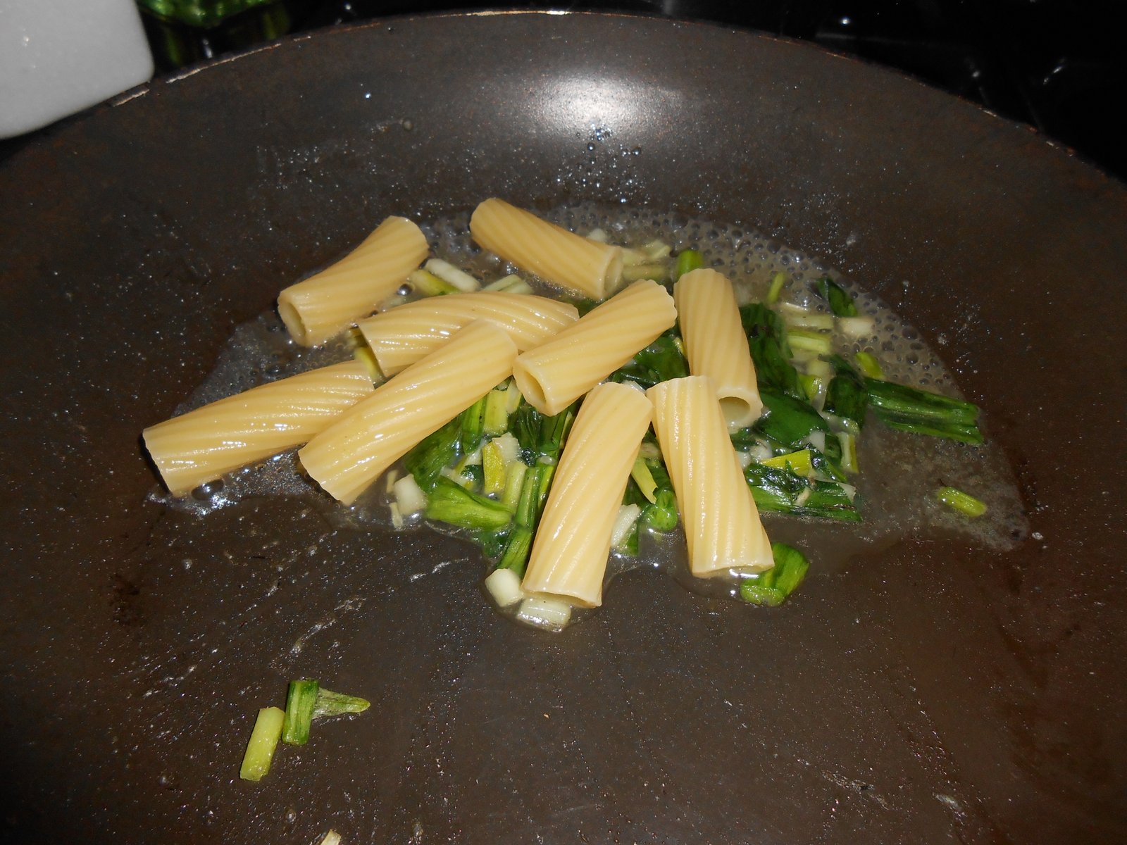 I like to serve ramps with pasta. I cook the pasta - I use rigatoni in this recipe - separately and don't cook the ramps until the pasta is done because the ramps have a very short cooking time. Drain the pasta for ease of use but keep some of the pasta's cooking water since you'll need it for the finished dish.